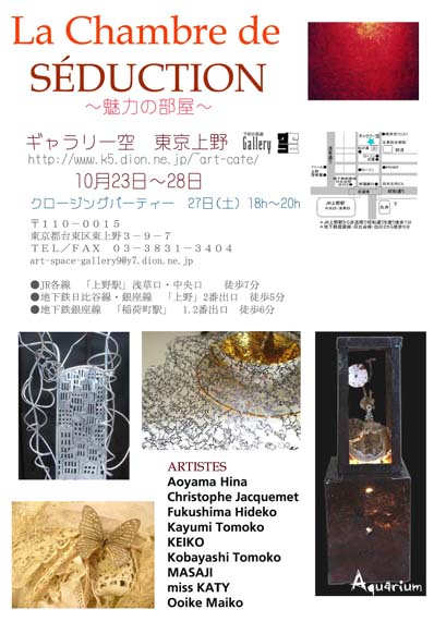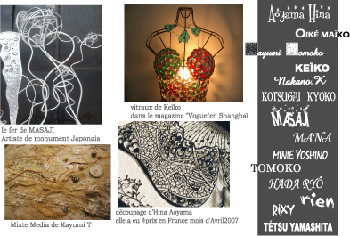 今回の東京上野【ギャラリー空】でのグループ展には、パブリックアート・モニュメントなどで活躍、受賞多数、ラジオなど多数出演のMASAJIART 2007年4月にフランスにて4つの賞を受賞、10月にはスイス・ジュネーヴWTO世界貿易機構個展 12月にはリヨンの美術館にて光フェスティヴァルに伴い展示 というフランス在住切り絵作家 蒼山日菜 シトロエン・プジョー・ルノーとオートモービル専任フォトグラファーの仏人作家ジャックメ、 仏人造形作家(アクアリウムアートなど) miss KATY を含め、 ジャンルが全て違う作家を集めた、遊園地の ようなグループ展を展開します。